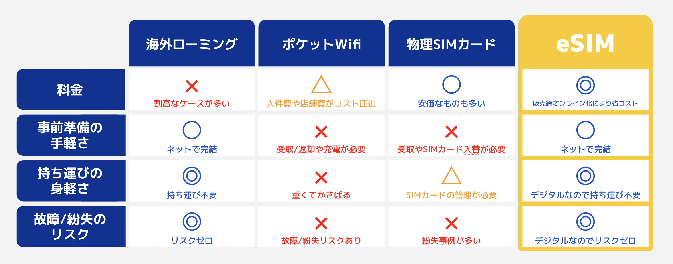 eSIM is superior to conventional communication methods in terms of "easy procedures," "lightness in carrying around," and "cost performance. eSIM is an innovative overseas smartphone communication method that users with eSIM compatible smartphones have "no reason not to choose.
